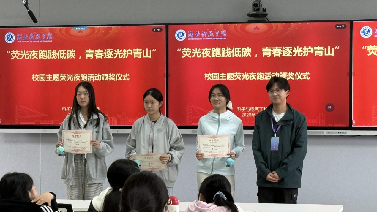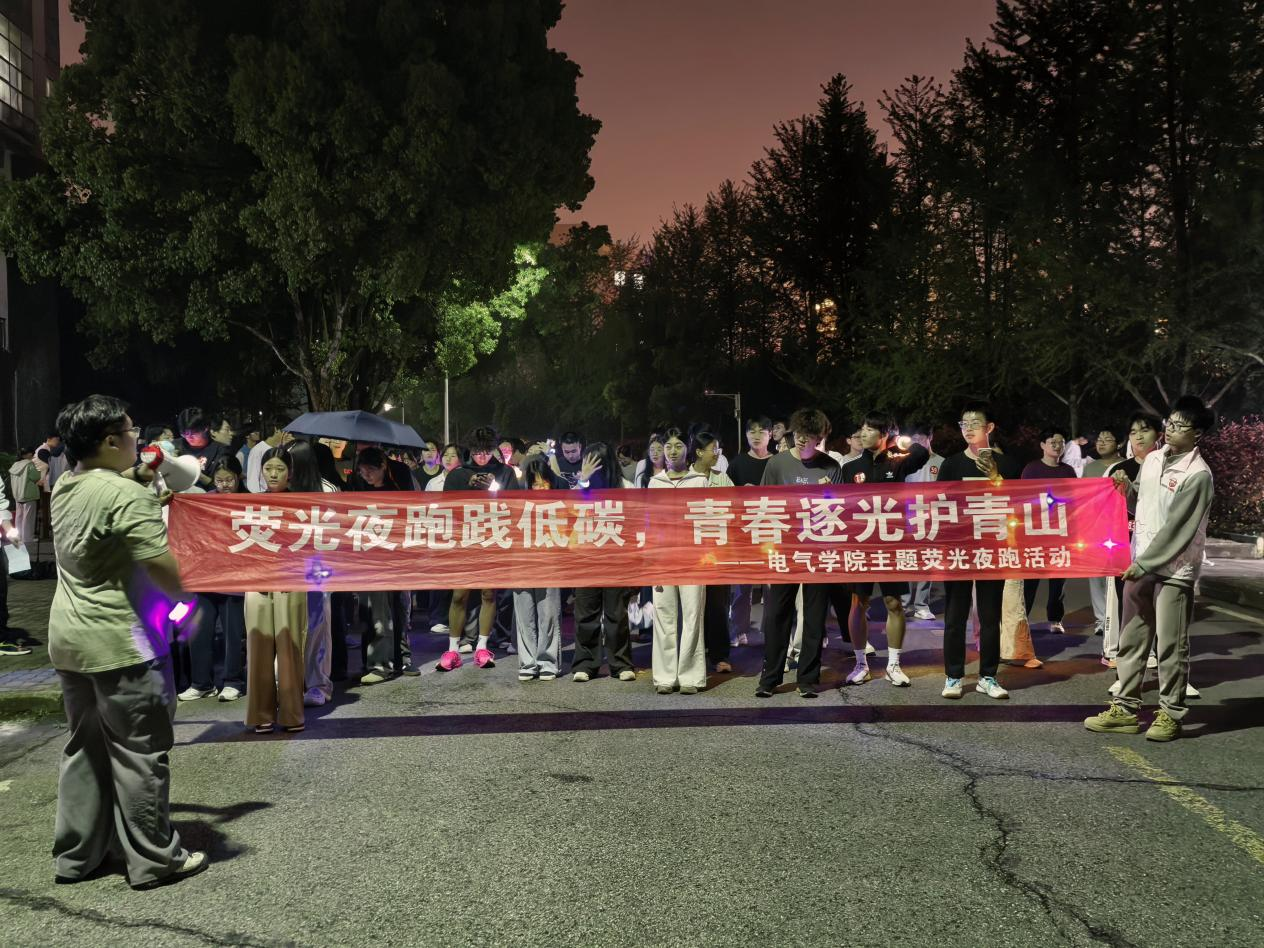 经过一个小时的激烈角逐,最终评选出男生组与女生组各前5名,所有完赛参与者均获得了环保主题纪念礼品。活动尾声,全体参与者点亮手中的荧光装备,共同拍摄集体合影,用荧光勾勒出青春守护地球的最美模样。“这次夜跑太有意义了,不仅锻炼了身体,还学到了很多环保和专业知识,原来我们所学的电路知识也能为环保出一份力。”参与活动的2025级电气工程及其自动化专业学生李同学说道。