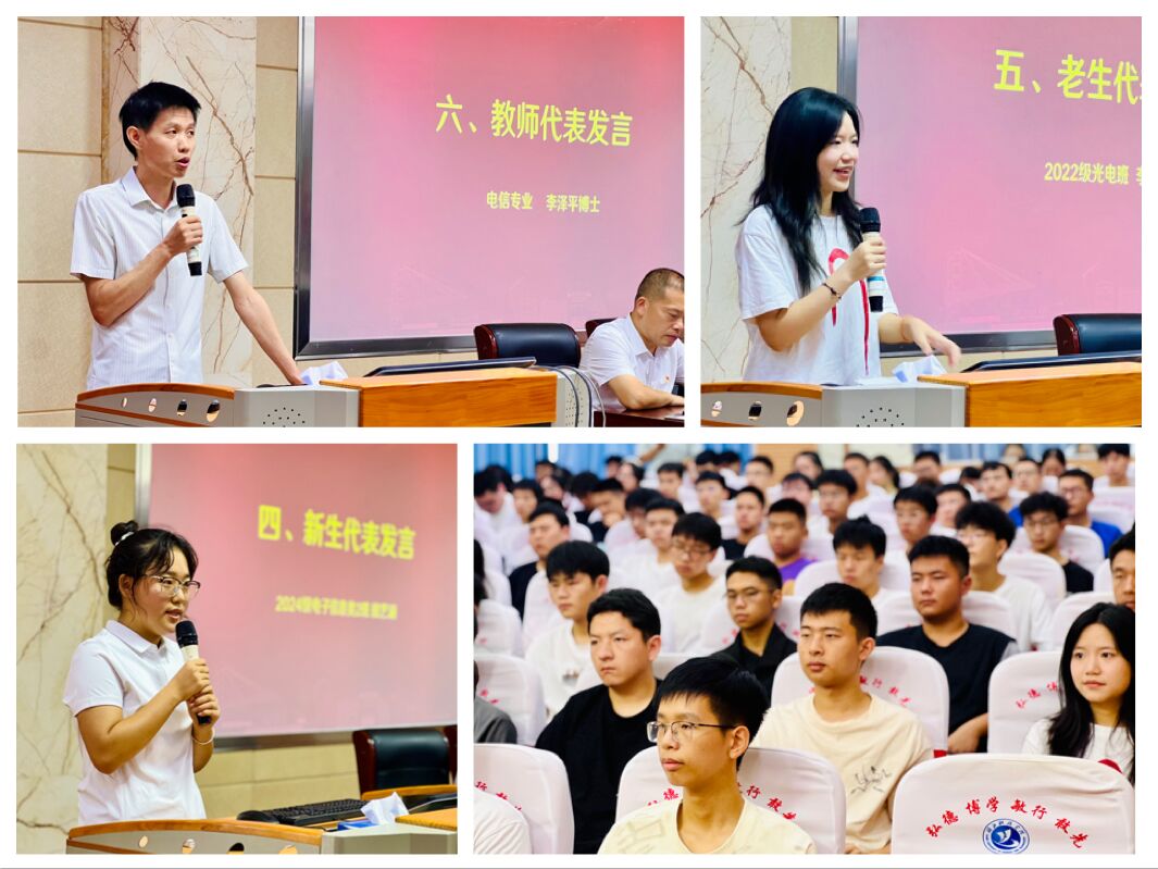 来自2024级电信专业的殷艺涵同学作为新生代表表达了对未来大学生活的期待和对知识的渴望。2022级光电专业的李高阳同学,分享了自己在学院的成长经历和学习心得,鼓励新生们积极融入大学生活,勇于探索和创新。教师代表电信专业李泽平博士在发言中强调了学术探索的重要性,并鼓励新生们积极参与科研活动,培养创新思维和实践能力。