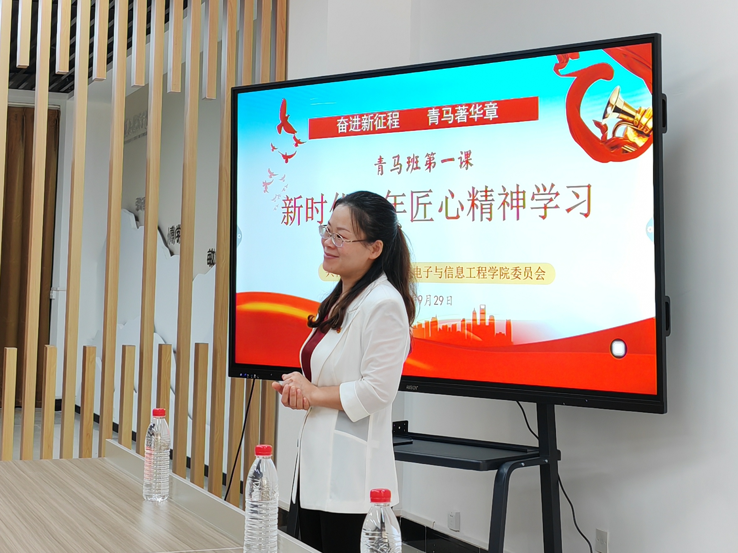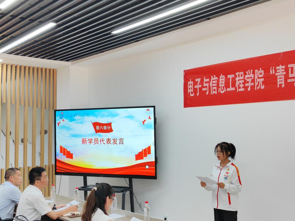 新学员代表张静静同学随后上台发言,她表达了对能够加入青马班的荣幸与期待,并呼吁全体学员珍惜本次培训机会,遵守纪律,认真学习,不断提升政治素质和理论水平,努力成为一名信念坚定、素质过硬的青年马克思主义者。