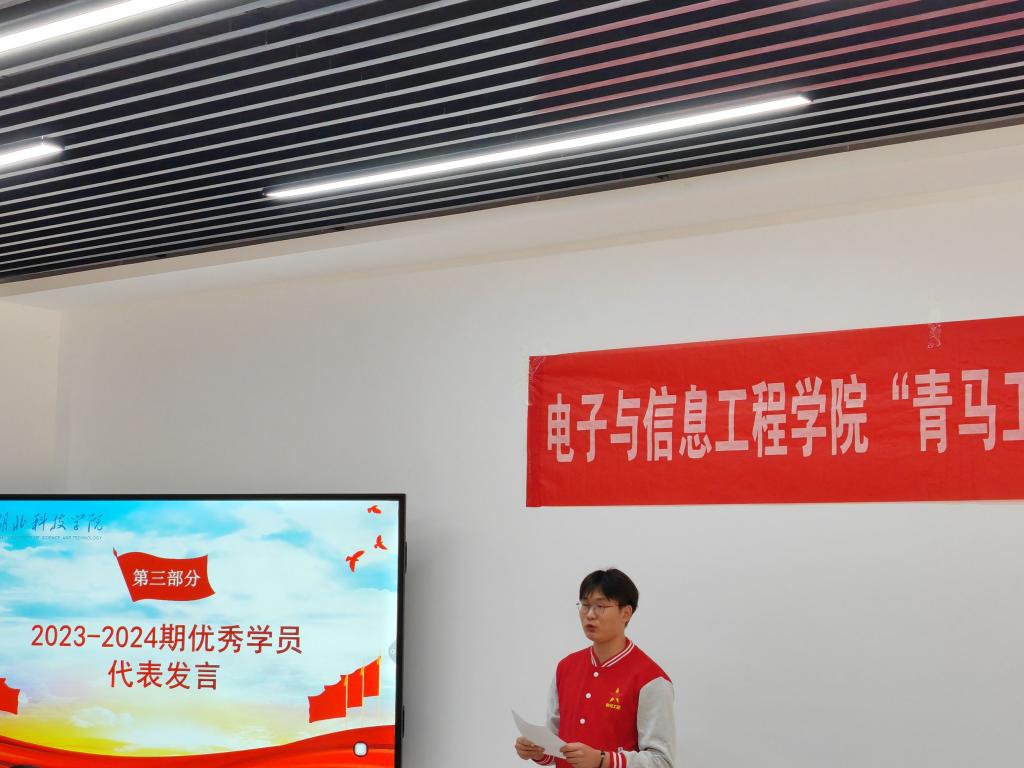 随后,上期青马班优秀学员代表周博爱同学上台发言。他结合自身经历,分享了在青马班的学习感悟,他表示,青马工程不仅是一段学习的旅程,更是一段信念的升华和责任的觉醒。周博爱同学号召学员们在本期培训中做到“学而思、思而行、行而成”,以实际行动践行马克思主义信仰,做马克思主义的忠实践行者。