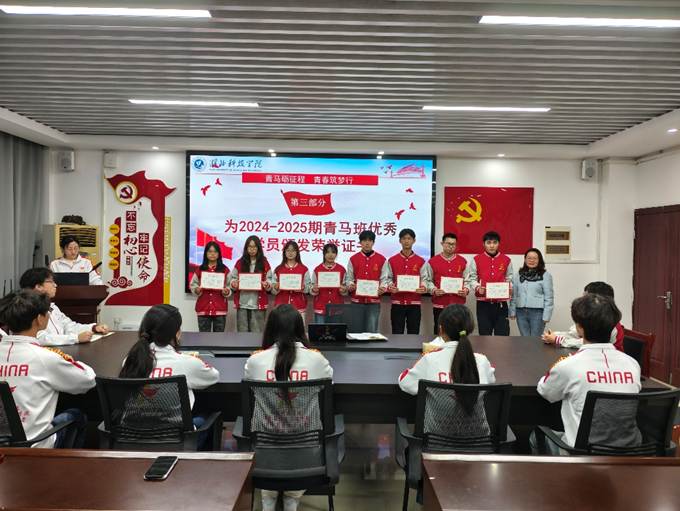 国歌毕,进入 “加冠时刻” 环节。金伟老师手持2024-2025期青马班优秀学员名单,逐一宣读获奖学员姓名。随后的“荣誉时刻”,优秀学员代表身着整洁校服,依次上台领奖。金伟老师为他们颁发荣誉证书,并与学员们并肩合影。现场掌声经久不息,既是对优秀学员过去一年付出的肯定,也为新一届学员树立了可学可做的榜样。